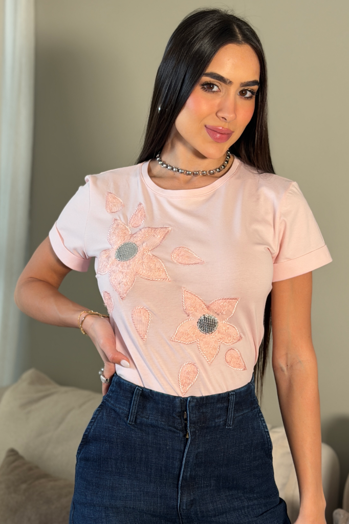Camiseta manga corta con aplicaciones florales en relieve, elaborada en poliéster con acabado suave y...