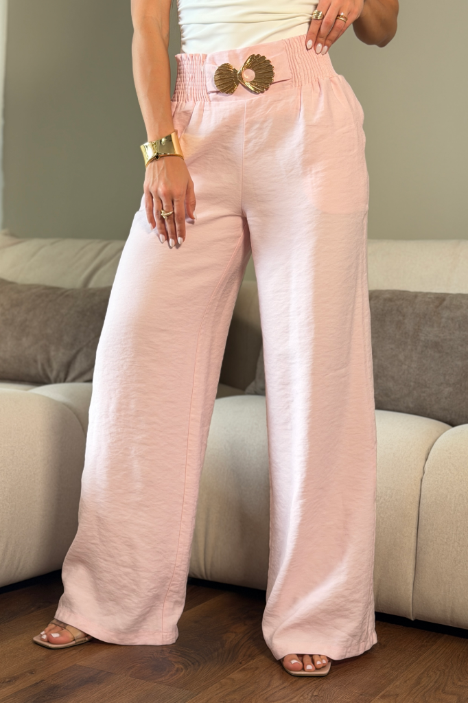 Pantalón Palazzo de Tiro Alto, elaborado en tela ligera de textura natural con caída suave...