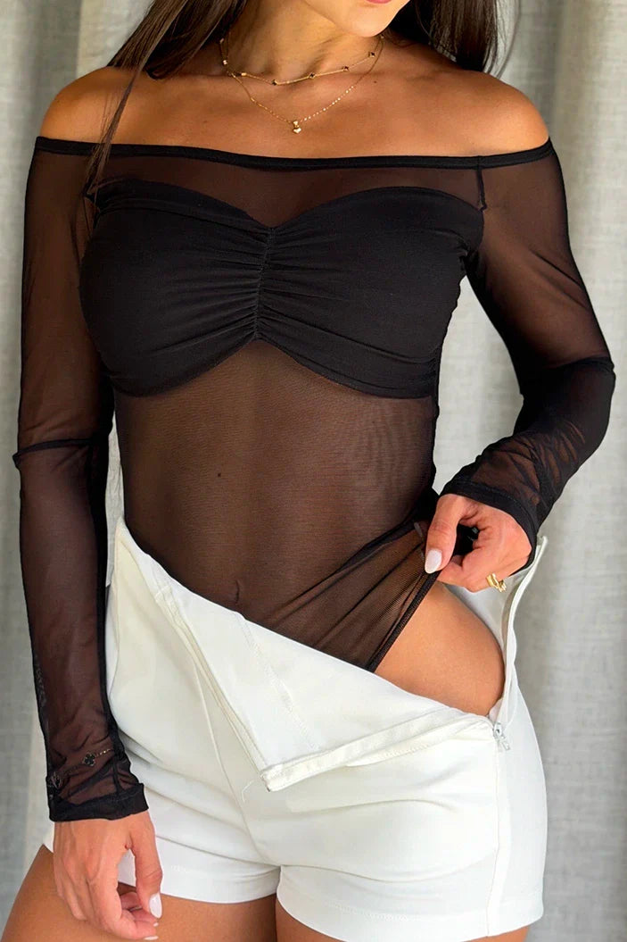 Body de manga larga en malla con fruncido frontal, elaborado enmalla elástica con forro suave....