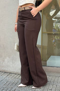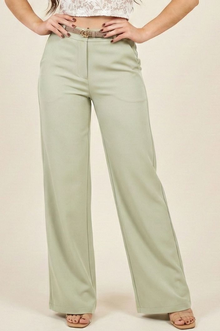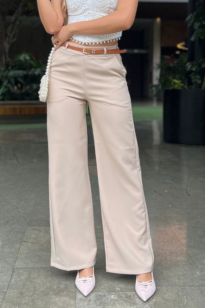 - Pierna ancha, bolsillos laterales y cinturón delgado