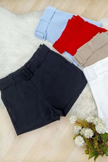 Short elaborado en tela poliéster con spandex, con cierre y bolsillos laterales. Incluye cinturón